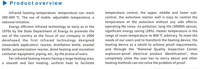 采用紅外線溫度加熱,使用溫度可達到300—600℃。使用穩定,溫度可調,國內首創。高效節能的紅外技術早在70年代由能源部向全國作重點推廣應用,我公司于2000年率先研制將紅外技術精心設計,合理應用在:反應釜、蒸餾釜、搪瓷釜、聚合釜、干燥設備、管道等容器上加熱和保溫,深受用戶的一致好評。 遠紅外電加熱裝置具有加熱面積大,升溫平穩而快.放熱均勻,溫度控制方便,可上、中、下分段控制,釜內釜壁溫度易控制,對釜內物料無任何副作用,運行無噪音,無污染,使用壽命長(30000h以上),節能顯著(28%以上)。加熱器溫度可在常溫到800。c范圍內任意設定。為滿足用戶需求我公司將加熱設備又進行改造,使加熱裝置整體達到防爆要求,并通過“防爆電器產品質量檢驗中心鑒定”,從而徹底解決了用戶一直擔心且其它加熱方法不能解決的防爆難題。 ![]() | |||||